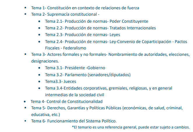 La evaluación será un trabajo integrador con todos los temas que alcancemos a desarrollar durante la cursada en función de lo conversado el martes. Partimos de la tensión, el conflicto, y rastreamos las políticas públicas, las normativas y el diseño institucional implicado, separando la paja del trigo: lo formal de lo informal, lo prescriptivo y lo descriptivo, el ser y el deber ser. Lo que los constitucionalistas distinguen como «Constitución Formal» y «Constitución Material».