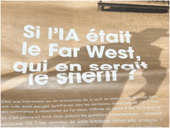 Una publicidad de una revista francesa (Correo Internacional, de Febrero 2024), que se pregunta si la IA es el Far West, ¿quien es el sheriff?