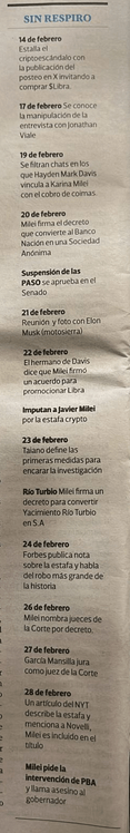 Reflexionamos sobre la deriva que tomó el gobierno a partir del 14/02, cuando comenzó el episodio/estafa de la moneda-cripto $Libra e hicimos una lectura de la siguiente cronología del diario Tiempo Argentino del Domingo 02/03: