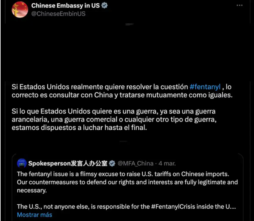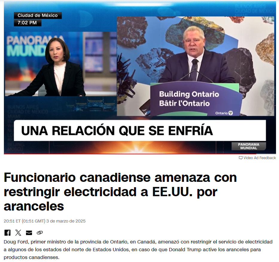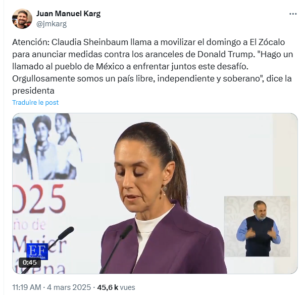 Y también mencionamos las respuestas del (por ahora) primer ministro Justin Trudeau, de algunos gobernadores de Estados de Canadá, de la Embajada China en EEUU y de Claudia Sheinbaun, de quien se esperan anuncios el Domingo 9/3/2025 en la Plaza del Zócalo de México DF a las 12h