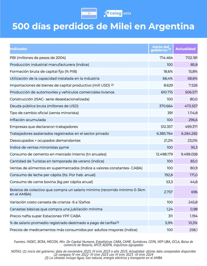 Después pasamos a comentar los 500 días de Milei en el Gobierno Argentino a partir de un informe de CELAG súper interesante. En el mismo combina una enormidad de datos de diferentes fuentes, no para hablar solo de la macro y el crecimiento, sino de los indicadores de la microeconomía que se relacionan con las agendas populares y cotidianas.