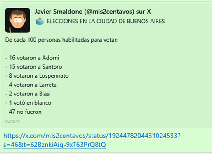 Conclusión: con la abstención y el desinterés, tmb gana Milei. 1) Porque con 30% le alcanza mientras el resto de la constelación esté disperso y 2) porque así va cumpliendo lentamente con pulverizar al Estado, que es su objetivo.