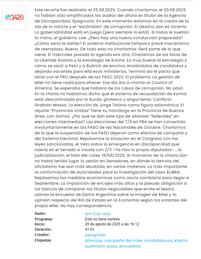 Este recorte fue realizado el 25.08.2025. Cuando charlamos, el 20.08.2025 no habían sido amplificados los audios del ahora ex titular de la Agencia de Discapacidad, Spagnuolo. En este momento estamos en la cresta de la ola de la noticia y el “escándalo” de corrupción. El destino aún es incierto. La gobernabilidad está en juego (pero siempre lo está). Si todos le sueltan la mano, el gobierno cae. ¿Pero hay una nueva conducción preparada? ¿Cómo sería la salida? El sistema institucional tampoco prevé mecanismo de reemplazo. Bueno. De todo esto no charlamos. Será parte de lo que viene.