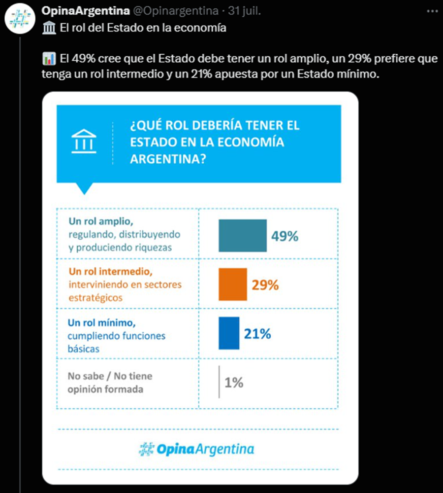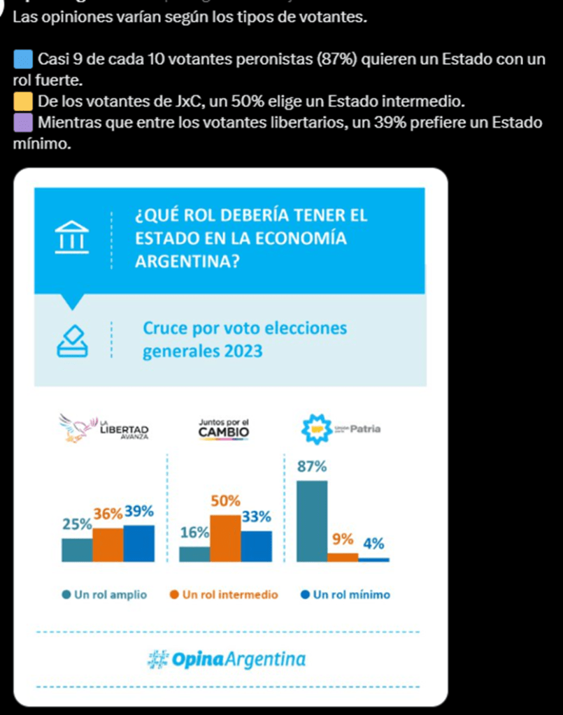 Leímos la encuesta de Opina Argentina sobre la imagen de Milei y la opinión respecto del Rol de Estado en la Economía según los votantes del propio Milei. No hay correspondencia.