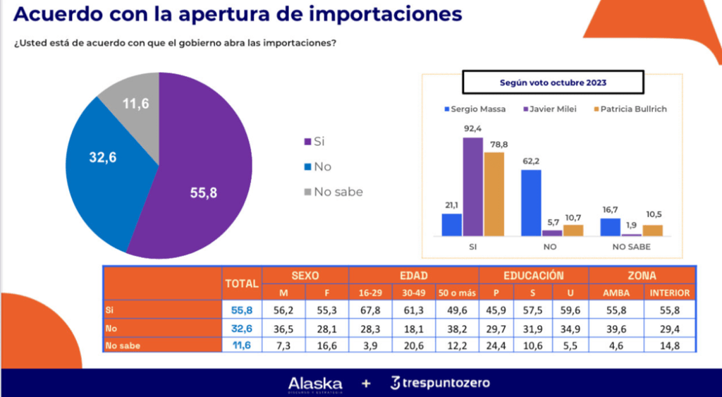 Por ejemplo: ¿Sabe ud qué significa una apertura indiscriminada de las importaciones? ¿Sabe cuáles son los múltiples efectos sobre el consumo, la producción, el trabajo, las cuentas macro en lo que es balanza comercial, balanza de dólares, etc?
